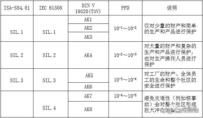 ตามมาตรฐาน IEC มันถูกแบ่งออกเป็น SIL1-SIL4 จากต่ำถึงสูง, SIL1-SIL3 จาก ISA 84.01 และ AK1-AI8 จากต่ำถึงสูงตาม DIN V VDE0804 ความสัมพันธ์ที่สอดคล้องกันระหว่างพวกเขามีดังนี้